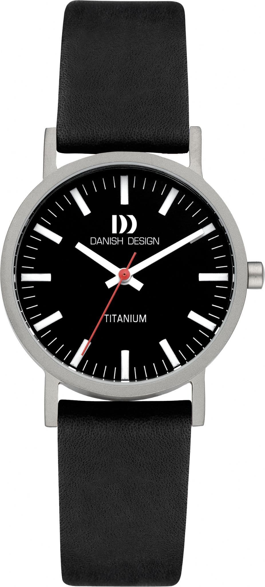 The sleek Danish Designs Women's Titanium Watch will suit women who prefer a high-quality watch paired with a minimalist dial. The circular, white dial displays bar-shaped, black hour indexes, a minute track around the perimeter, and slender, black hands. The silver-toned, circular bezel and case are made from titanium for ultimate strength and durability. Made from genuine leather, the black watch strap is secured with a buckle clasp for a classic look.