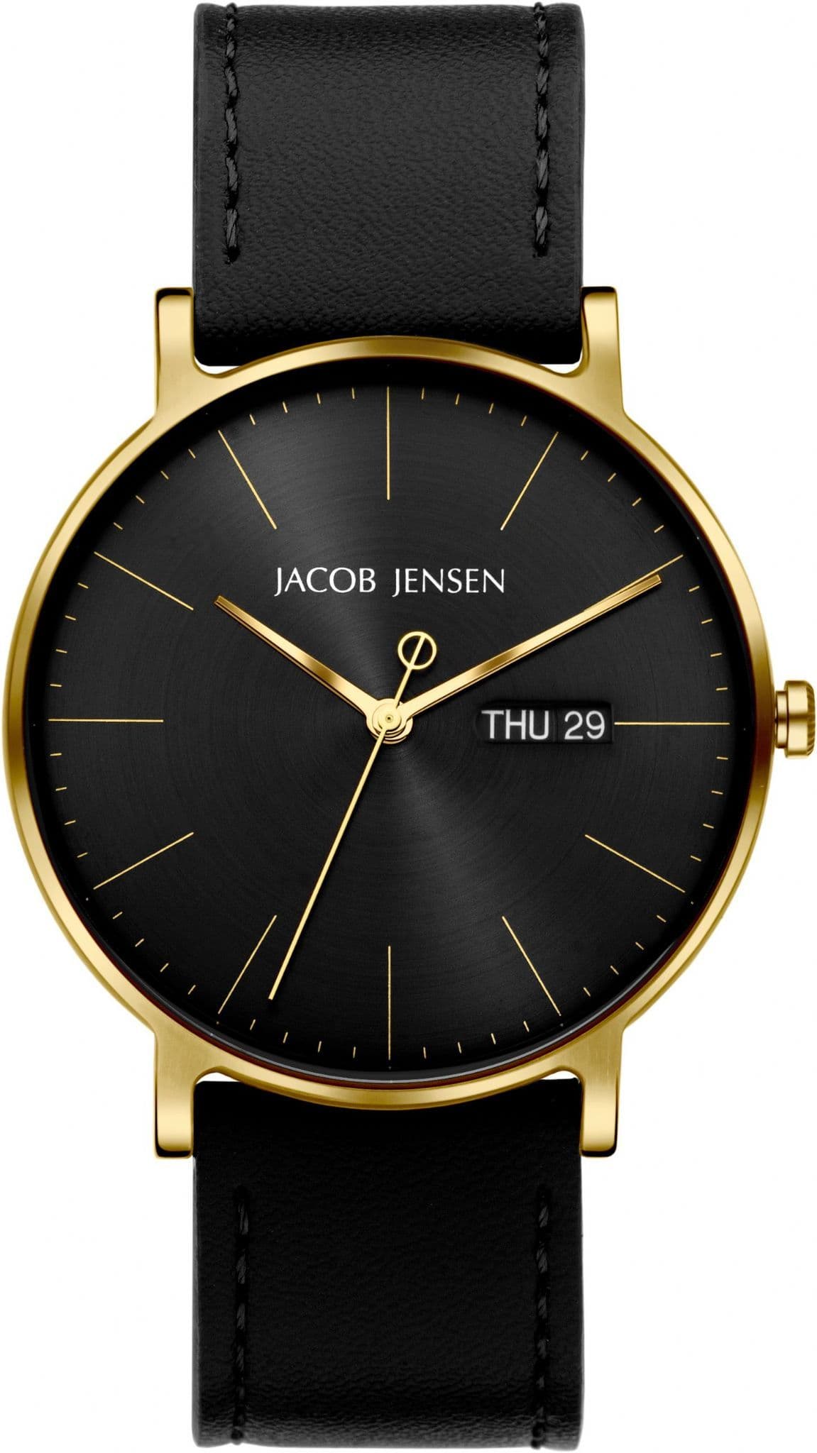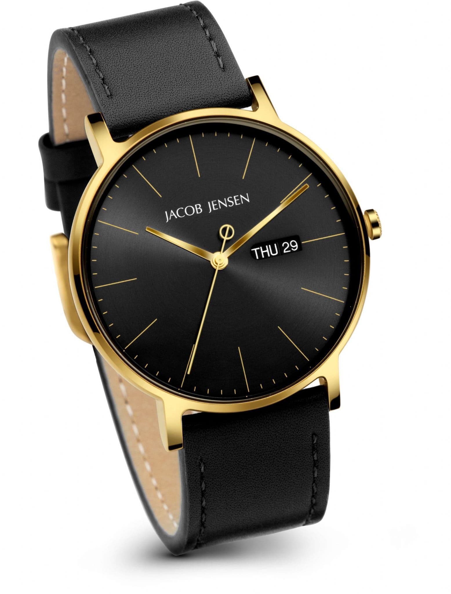 The Jacob Jensen 165 Timeless Nordic Contemporary Watch features a stainless steel case with a Black dial Gold Case . The watch also features Sapphire Crystal glass and a Vegan leather strap. Timepieces Direct are authorised Jacob Jensen stockists. These watches are supplied with a 2 year warranty and we offer free UK delivery.The Jacob Jensen 165 Specifications