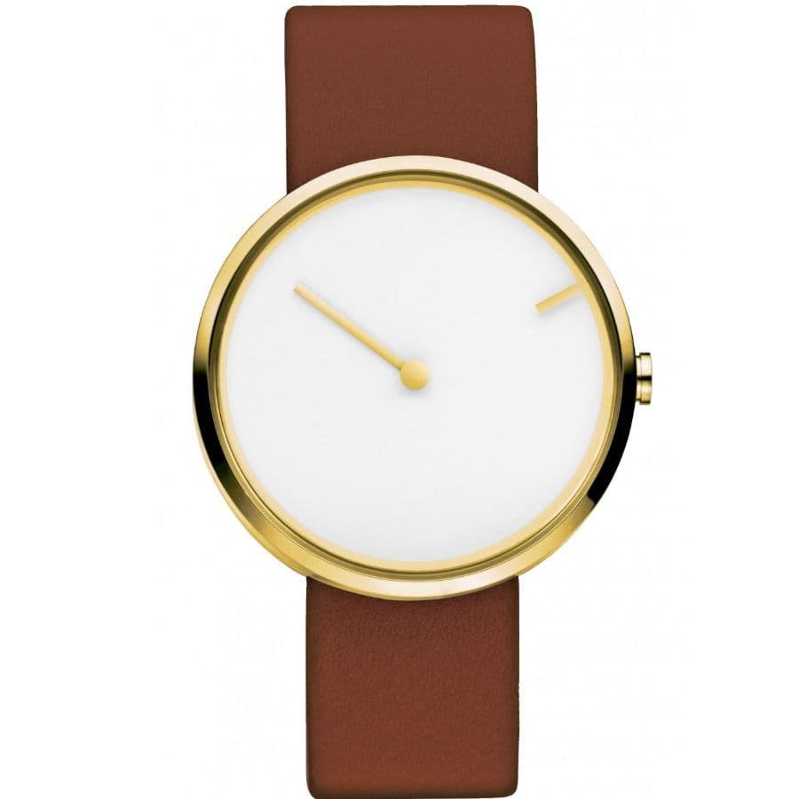 The Jacob Jensen Curve Series Watch 254 features a stainless steel, polished gold case, white dial and a brown leather strap.The New Curve watch offers a new take on the modern unisex watch. The 38mm watch case is not attached in the classical way to the strap but sides over it, making it possible to get rid of the classic strap attachments on the case that could now be designed as an independent unit. The watches organic form is emphasised by the slightly curved glass and the combination of a polished bezel and matte case surface. The Quartz movement drives a conventional hour plus a rotating disc with a minute indication.