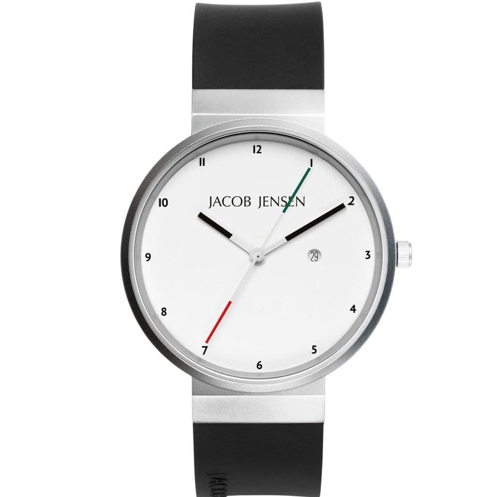 This Jacob Jensen New Series 703 Gents Watch features a Stainless steel case with a white dial. The watch also features mineral crystal glass and black silicone strap. Timepieces Direct are authorised Jacob Jensen stockists. These watches are supplied with a 2 year manufacturers warranty and we offer free UK delivery.