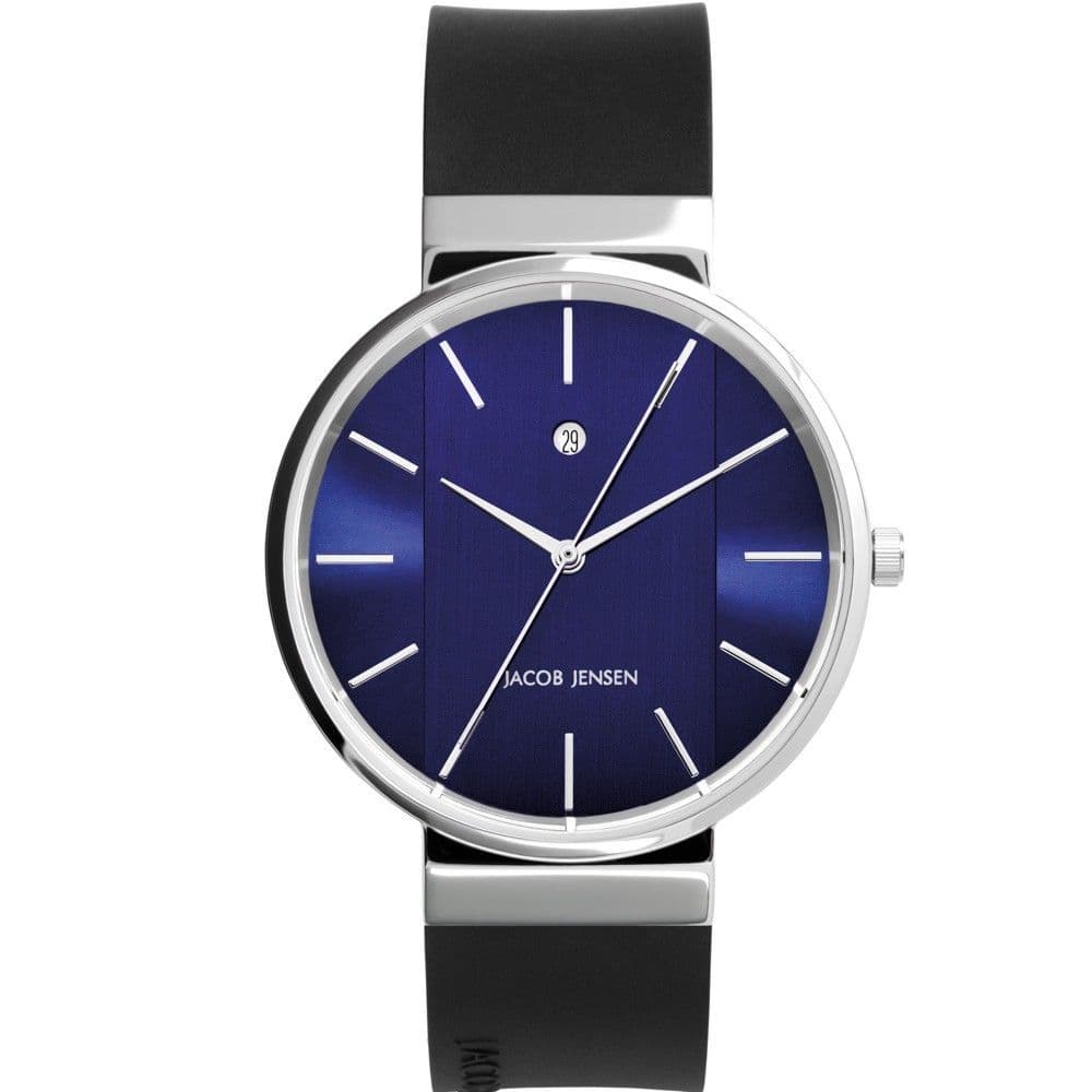 This Jacob Jensen 709 New Series Watch features a stainless steel case with a blue dial. The watch also features mineral crystal glass and black silicone strap. Timepieces Direct are authorised Jacob Jensen stockists. These watches are supplied with a 2 year manufacturers warranty and we offer free UK delivery.